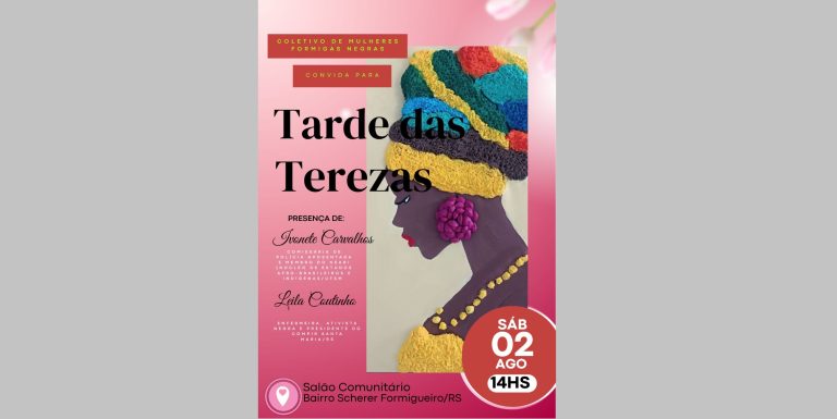 Como parte das atividades do Julho das Pretas, o Coletivo de Mulheres Formigas Negras promove no próximo sábado, dia 02, a “Tarde das Terezas”, um encontro voltado à celebração, reflexão e fortalecimento das vozes femininas negras. O evento será realizado a partir das 14h no Salão Comunitário do Bairro Scherer (Comunidade Quilombola Maniel Diniz), em Formigueiro.